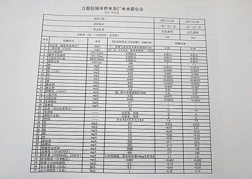 2017年12月江都區(qū)城市供水出廠水水質(zhì)公示