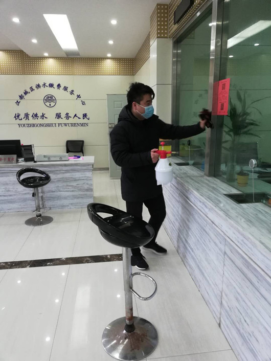 “在如此特殊時期,一線干部職工為保障群眾的供水安全,每天堅持在供水一線,我很感動,希望盡自己的微薄之力為一線干部職工的安全提供保障。”王俊說道。據(jù)了解,在春節(jié)值班抗擊疫情初期,公司沒有足夠的口罩,王俊就從家中拿出自備中的絕大部分口罩分給營業(yè)所服務(wù)大廳的值守人員和面向基層一線的服務(wù)同志。除此之外,王俊還自帶消毒液,每天堅持帶頭定時定點對營業(yè)大廳進行消毒,為營業(yè)所工作人員和前來辦理相關(guān)應(yīng)急業(yè)務(wù)的居民提供安全放心的服務(wù)環(huán)境。