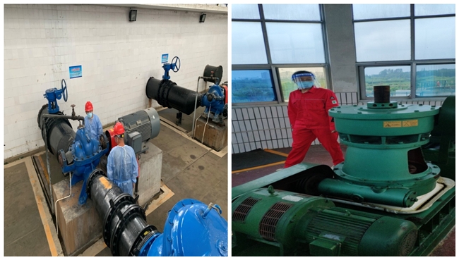 圖六:二水廠設(shè)備組成員檢查機泵運行狀況 圖七:三水廠設(shè)備組成員檢查機泵運行狀況