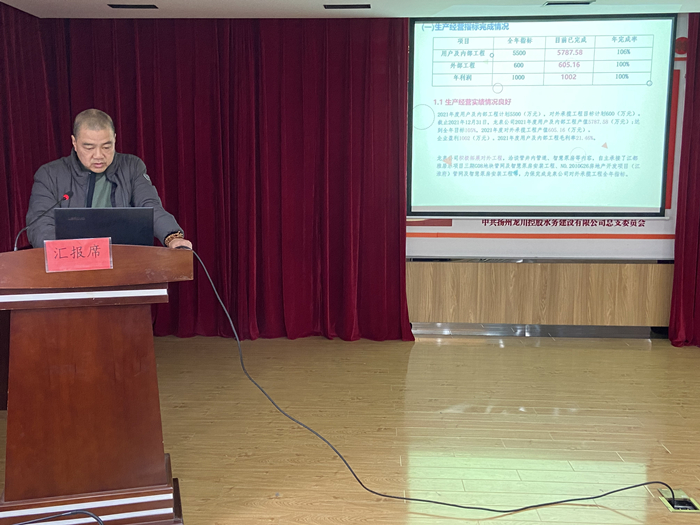 在本次大會匯報交流環(huán)節(jié),分別聽取了計劃財務(wù)部、運(yùn)營技術(shù)部、黨群工作部、自來水公司、惠民區(qū)域供水公司、龍泉建設(shè)工程公司、龍川污水處理公司等七個部門單位2021年工作總結(jié)報告。各部門、子公司負(fù)責(zé)人分別圍繞2021年全年生產(chǎn)經(jīng)營指標(biāo)、重點工作完成情況、存在的主要問題、解決對策以及2022年工作計劃作了交流匯報。