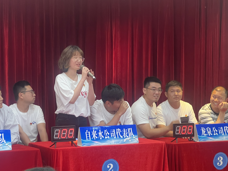 此次比賽分為小組共答題、個人必答題、搶答題、你劃我猜、風(fēng)險題五種形式,并分五輪進(jìn)行。共有五支代表隊參賽,分別是惠民、自來水、龍泉、水務(wù)、污水公司代表隊,且每個代表隊人員都是經(jīng)過層層篩選脫穎而出的。大家顯然是有備而來的,競賽過程精彩激烈,參賽選手們有的運(yùn)籌帷幄、有的胸有成竹、有的應(yīng)對自如,各代表隊你追我趕、搶答器的聲音此起彼伏,現(xiàn)場戰(zhàn)況異常激烈,展示出了新時代水務(wù)公司團(tuán)員青年的風(fēng)采。