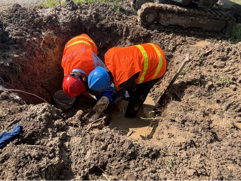 管網(wǎng)搶修組進(jìn)行現(xiàn)場(chǎng)搶修。維修人員防護(hù)齊全地進(jìn)入土坑中,維修PVC110管材使用鍍鋅包箍。維修人員嫻熟地在泄漏點(diǎn)周圍,沿管道圓周方向,徹底清潔需要安裝包箍的區(qū)域,確保安裝表面完全干燥、清潔。隨后兩位維修人員將兩個(gè)帶橡膠墊的半殼扣合在管道上,包裹住泄漏點(diǎn),確保包箍在管道上位置居中,并且沒有歪斜。用手將所有的螺栓帶上,逐步、均勻地?cái)Q緊各個(gè)螺栓。在兩位維修人員的默契配合下,整個(gè)維修過程僅用時(shí)十五分鐘,展示了維修人員過硬的維修技術(shù)。在漏點(diǎn)修復(fù)后進(jìn)行了開閥試水,無問題后機(jī)械挖掘組在現(xiàn)場(chǎng)路面恢復(fù)。