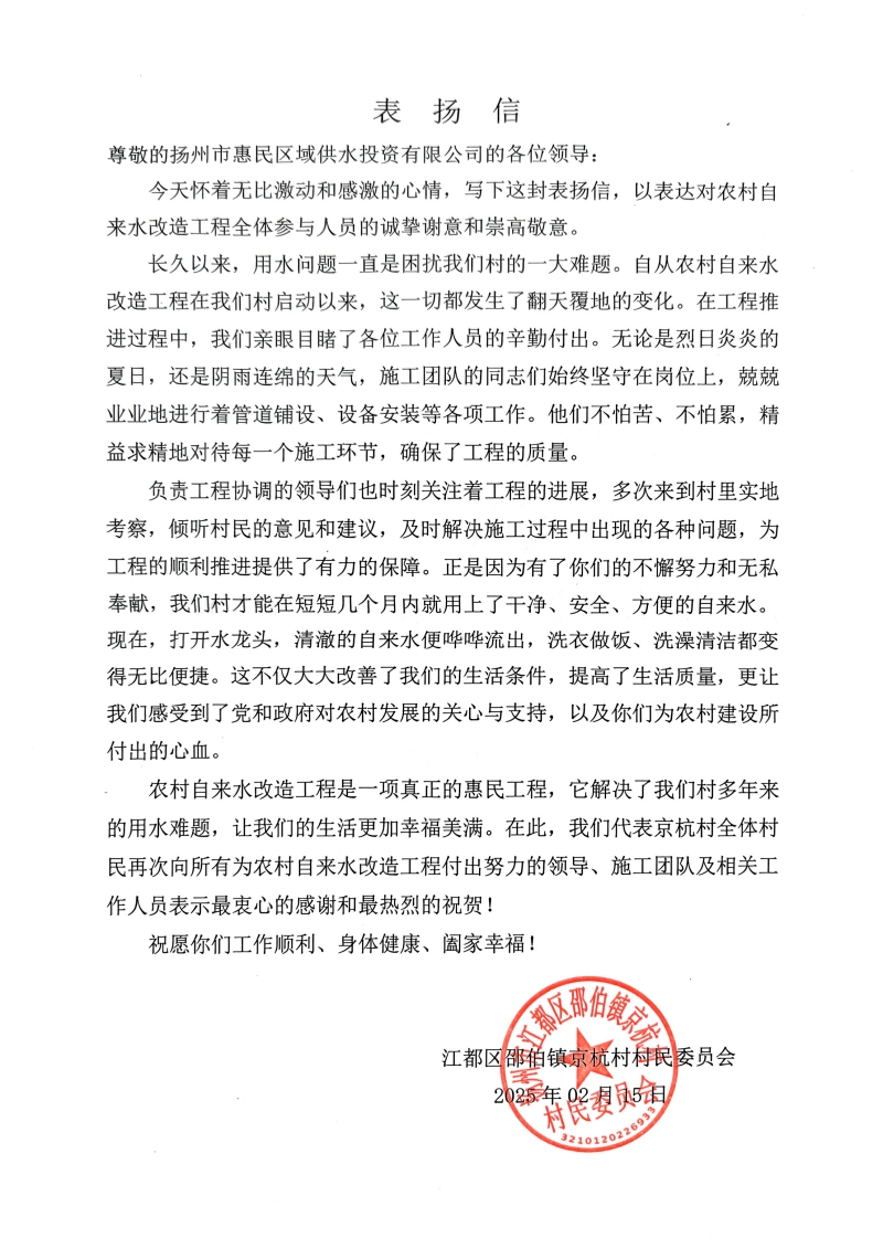 “以前村里因?yàn)橛盟畣?wèn)題,鄰里之間偶爾會(huì)鬧矛盾,現(xiàn)在水的問(wèn)題解決了,大家的關(guān)系也更和睦了。”村干部笑著說(shuō)。村民們自發(fā)組織起來(lái),寫(xiě)了這封表?yè)P(yáng)信,用最樸素的方式表達(dá)感激之情。“這封信雖然寫(xiě)得簡(jiǎn)單,但每一個(gè)字都是我們的心里話(huà)。貴公司幫我們解決了大難題,我們打心底里感謝!”